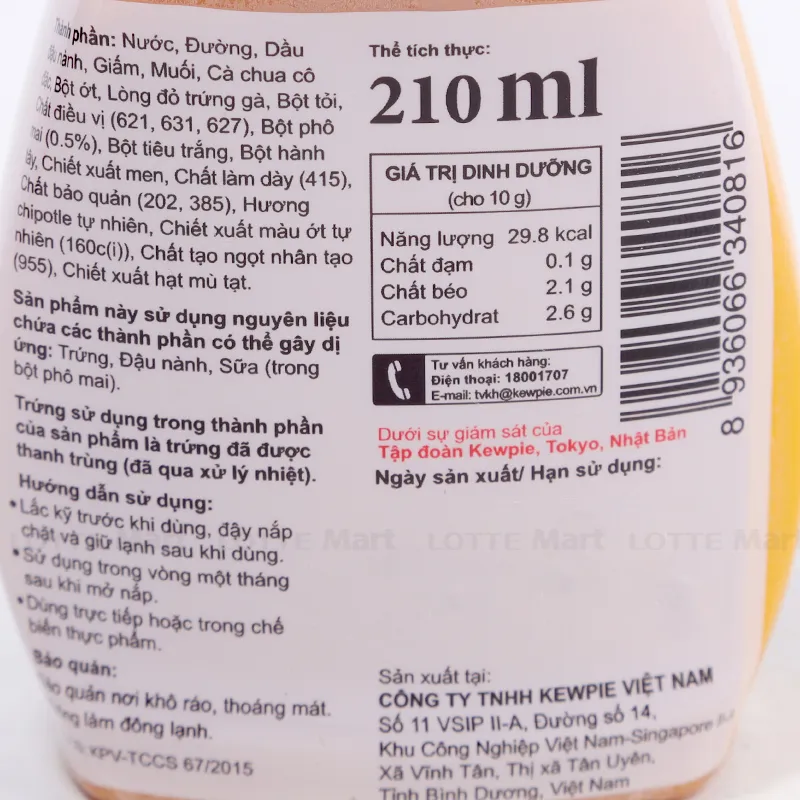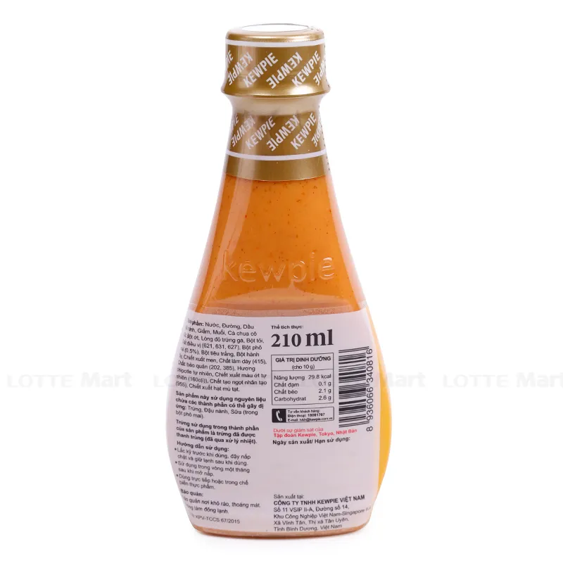 Nước sốt phô mai cay Kewpie được sản xuất trên dây chuyền hiện đại và khép kín mang đến cho cơ thể các dưỡng chất từ các thành phần tự nhiên. Ngoài ra, sản phẩm còn kích thích khẩu vị của người dùng giúp cho ngon miệng hơn. Thành phần: Nước, đường, dầu đậu nành, giấm, muối, cà chua cô đặc, bột ớt, lòng đỏ trứng gà, bột tỏi, chất điều vị (621, 631, 627), bột phô mai (0.5%), bột tiêu trắng....Hướng dẫn sử dụng: dùng chung với các món ăn chiên, nướng, rau sống....Bảo quản ở nơi khô thoáng, tránh ánh nắng trực tiếp.