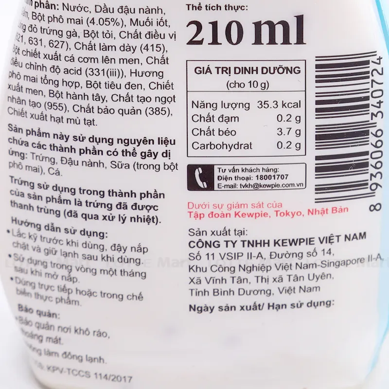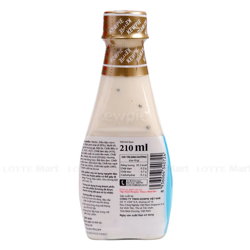 Nước Sốt Phô Mai Kewpie 210ml một loại sốt gia vị đa năng giúp làm tăng mùi vị cho các món rau sống, thịt nướng, cá hồi nướng và tôm luộc... Sản phẩm được làm từ các nguyên liệu chọn lọc tự nhiên kỹ càng và chất lượng giúp mang đến hương vị thơm ngon cho các món ăn khi sử dụng. Vị phô mai béo hài hòa của sốt không những hợp khẩu vị của nhiều người mà còn mang đến vị ngon tuyệt vời cho các món rau, thịt nướng..... giúp các thành viên trong gia đình bạn ăn thật nhiều mỗi ngày. Thành phần: Nước, dầu, đậu nành, đường, giấm, bột phô mai (4%), muối, lòng đỏ trứng gà, bột tỏi, chất làm dày (415), chiết xuất men, bột tiêu đen, chất điều vị (364ii)....Hướng dẫn sử dụng: Lắc kỹ trước khi sử dụng. Đậy nắp chặt, bảo quản lạnh sau khi dùng và sử dụng trong vòng 1 tháng. Hướng dẫn bảo quản: Bảo quản nơi khô ráo, thoáng mát.