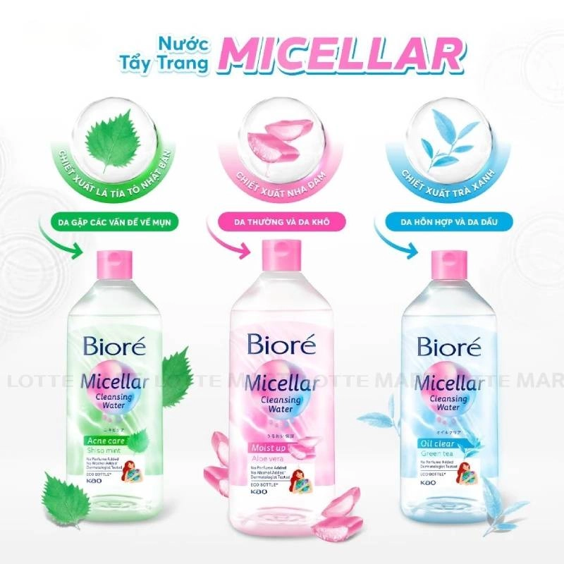 Nước Tẩy Trang Biore Micellar Sạch Nhờn được sử dụng công nghệ Micellar siêu nhỏ từ Nhật Bản, giúp phân tử Micellar đi sâu vào lỗ chân lông, loại bỏ triệt để lớp trang điểm và bụi bẩn mà không cần chà xát mạnh.
