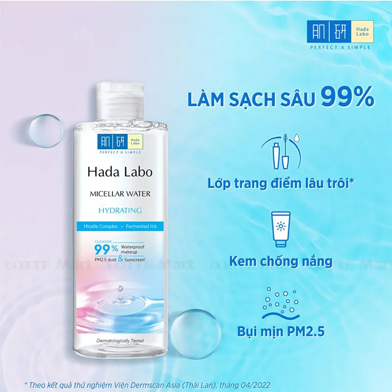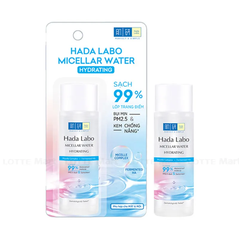 - Nước Tẩy Trang Hada Labo Micellar Water Hydrating nhẹ nhàng làm sạch sâu 99% lớp trang điểm lâu trôi, kem chống nắng, bụi mịn PM2.5, làm giảm tình trạng mất nước và tăng cường độ ẩm cho da đến 1.5 lần.