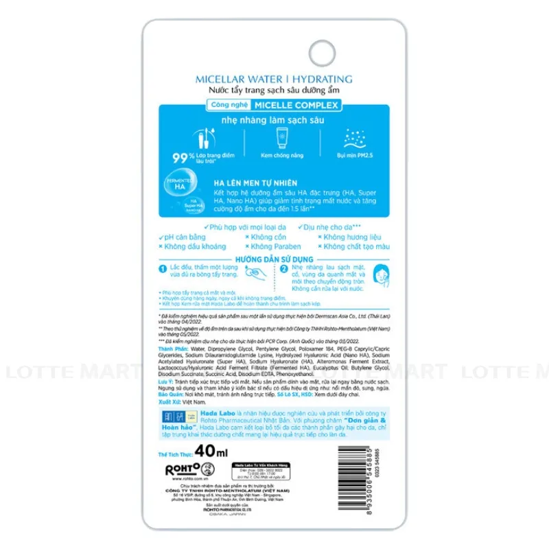 - Nước Tẩy Trang Hada Labo Sạch Sâu Dưỡng Ẩm với công nghệ Micelle Complex nhẹ nhàng làm sạch sâu 99% lớp trang điểm lâu trôi, kem chống nắng và bụi mịn PM2.5.