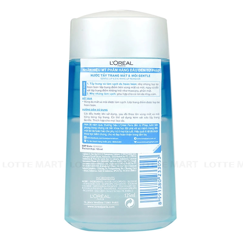 - Nước Tẩy Trang Mắt Môi L'Oreal Paris Dịu Nhẹ Cho Da với công thức đặc biệt dành cho loại da này, sản phẩm giúp rửa sạch lớp trang điểm mắt, môi thật dịu nhẹ, hiệu quả ngay với cả son, mascara và kẻ mắt nước không trôi.