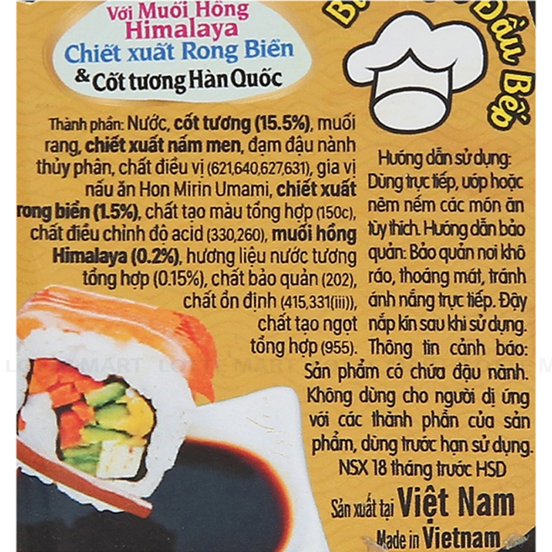 - Với thiết kế tiện lợi, nước tương này là người bạn đồng hành lý tưởng cho mọi bữa ăn, giúp bạn tạo ra những món ăn ngon miệng và ấm cúng cho gia đình.