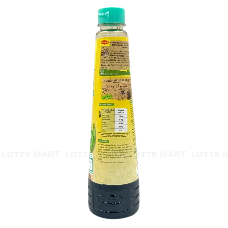 - Nước tương Maggi giảm đường có hàm lượng muối vừa đủ, được lên men tự nhiên từ đậu nành tạo nên mùi vị thơm ngon. Sản phẩm được sẽ cung cấp cho cơ thể các chất đạm dồi dào, còn bổ sung i ốt, đường, carbohydratei và một số chất khác.