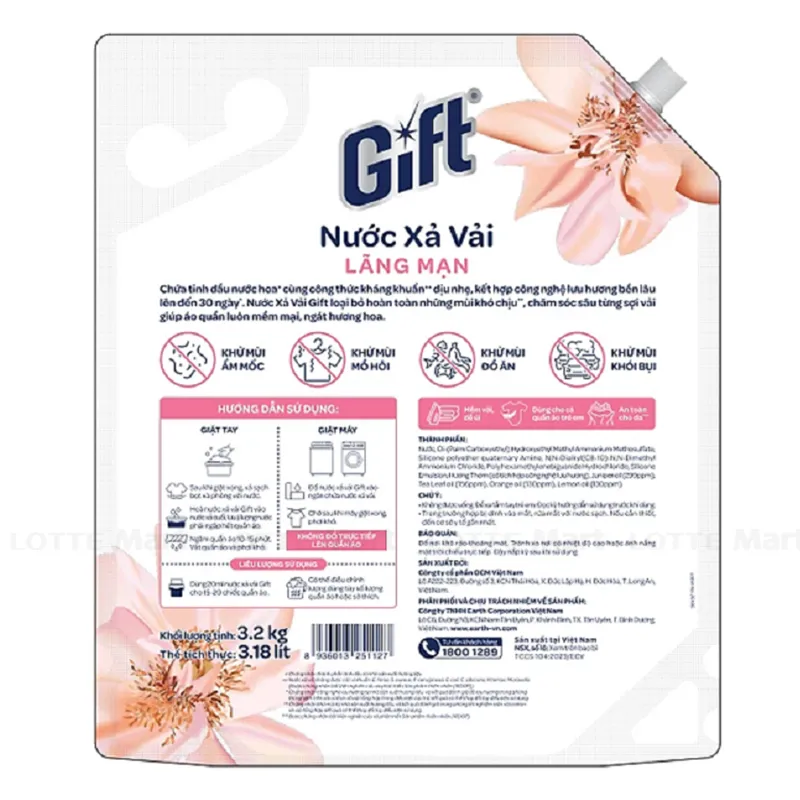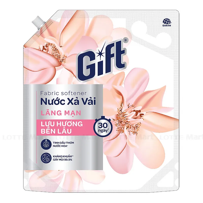- Nước Xả Vải Gift Lãng Mạn với công thức đánh bay vết bẩn cứng đầu, khả năng kháng khuẩn 99,9% cùng hương thơm mộng mơ lưu hương bền lâu.