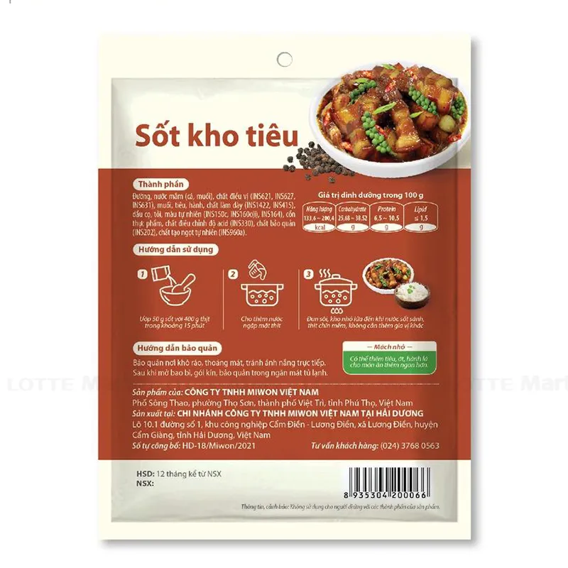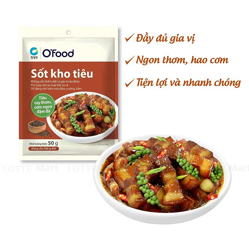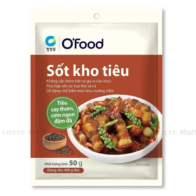 Sốt Kho Tiêu O'food Gói 50G là loại sốt sệt, sánh, đã chứa đủ gia vị, tiện lợi, chỉ cần bóc ra ướp với thịt và chế biến các món kho.