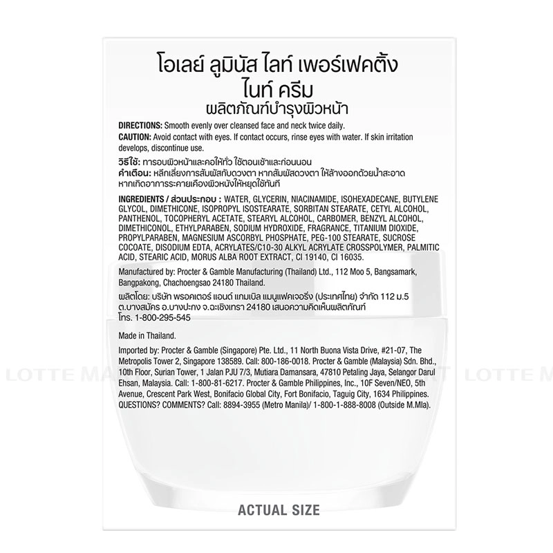 - Kem Dưỡng Ẩm Ban Đêm Olay Luminous Giúp Trắng Da với phức hợp làm sáng da từ Niacinamide tinh khiết giúp cấp ẩm cho da, thúc đẩy quá trình tái tạo bề mặt da, tăng sinh collagen, góp phần ngăn hắc sắc tố di chuyển lên bề mặt da, làm sáng và đều màu da.