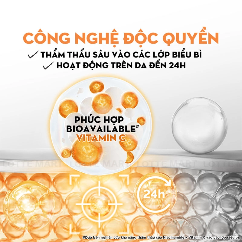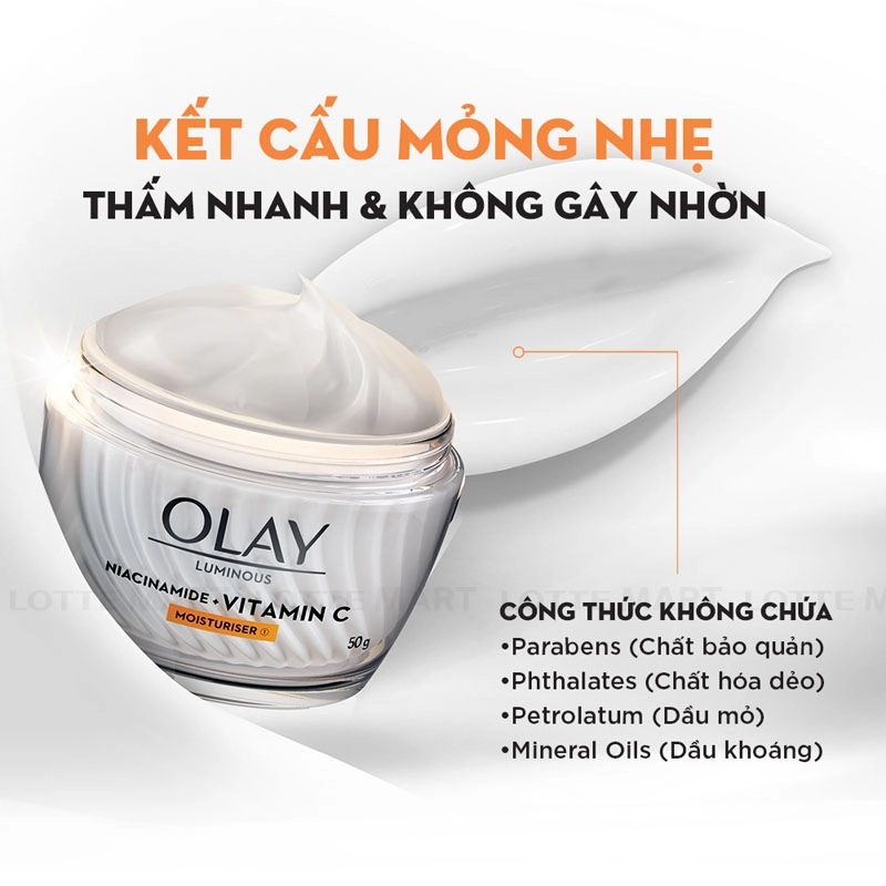 - Kem Dưỡng Trắng Da Olay Luminous Niacinamide Và Vitamin C với phức hợp Bioavailable Vitamin C gồm Niacinamide và Vitamin C với tính ổn định cao, không chỉ hoạt động mạnh mẽ trên bề mặt mà còn thẩm thấu sâu vào 10 lớp biểu bì, tăng hiệu quả tác động trên da.