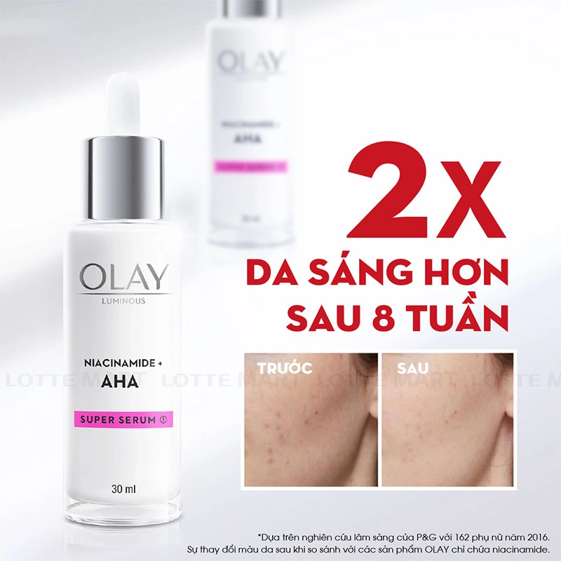 - Serum Dưỡng Da Olay Luminous Niacinamide Và AHA Super với công thức tiên tiến chứa phức hợp Niacinamide và AHA mang lại hiệu quả trong việc cải thiện tình trạng da không đều màu và các khuyết điểm cứng đầu.