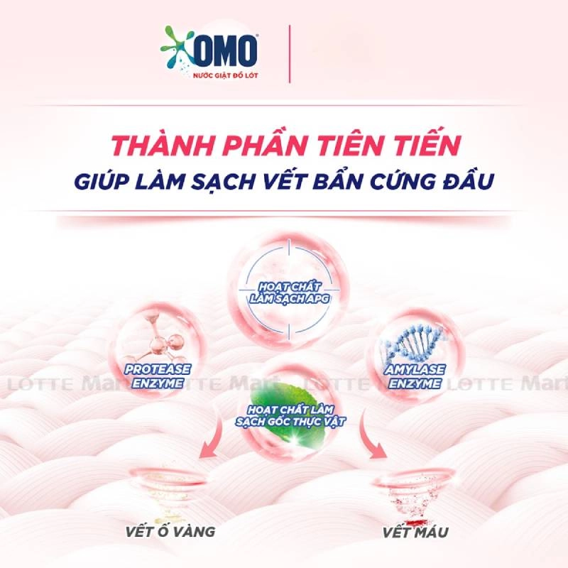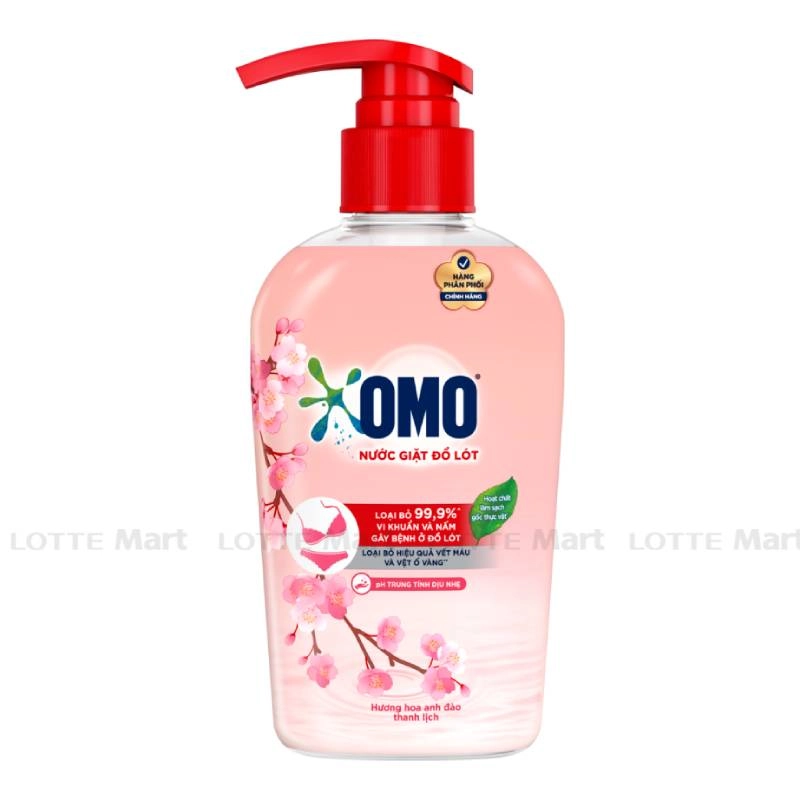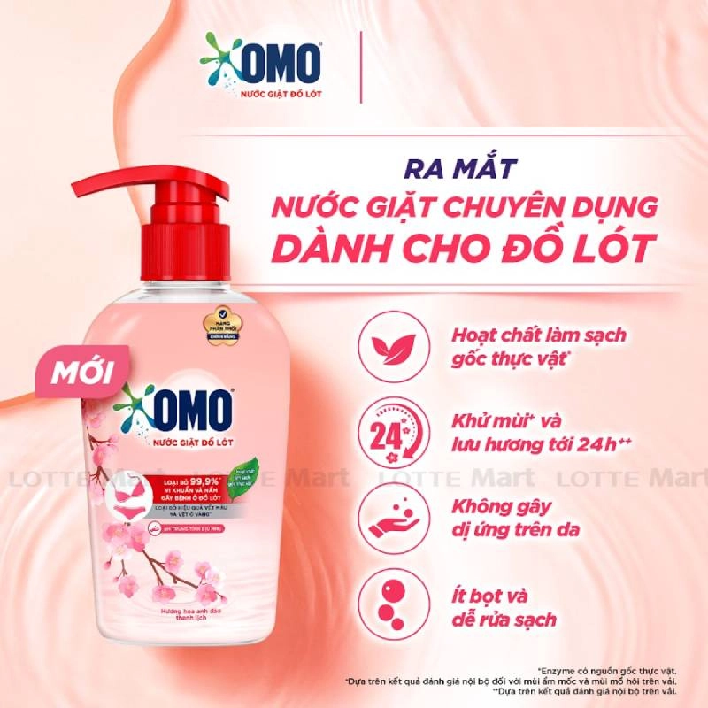 - Nước Giặt Đồ Lót Omo Hương Hoa Anh Đào có khả năng làm sạch 99,9% vi khuẩn và nấm gây bệnh trên đồ lót và được thử nghiệm trên các loại vi khuẩn S.aureus, E.coli, P.aeruginosa, E.faecalis, E.cloacae, K.pneumoniae và Nấm Canida albicans.