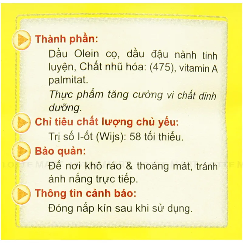 - Dầu olein, dầu đậu nành tinh luyện, chất nhũ hóa (475), vitamin a palmitat.
