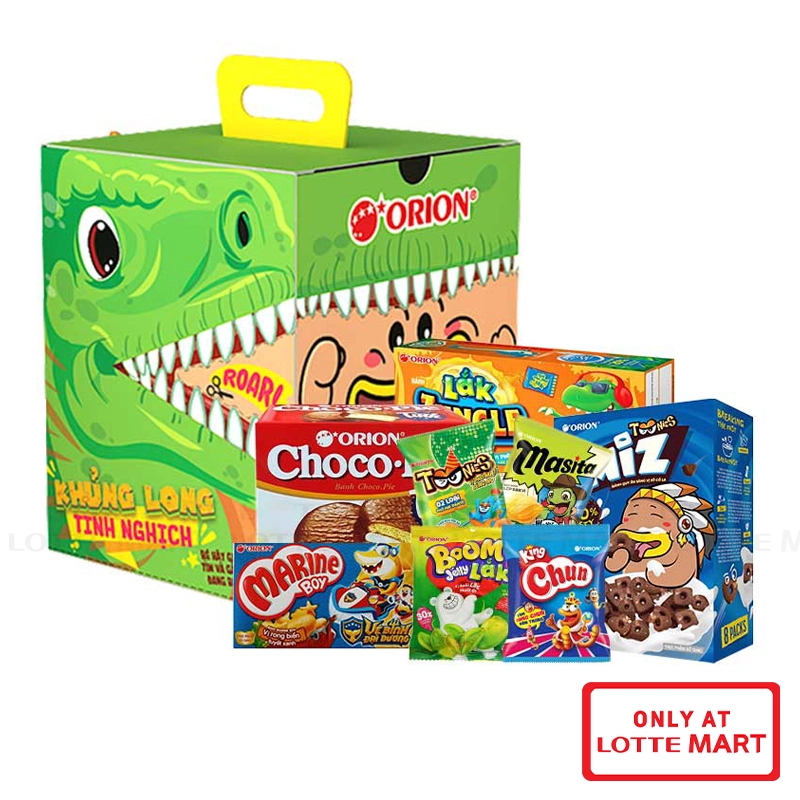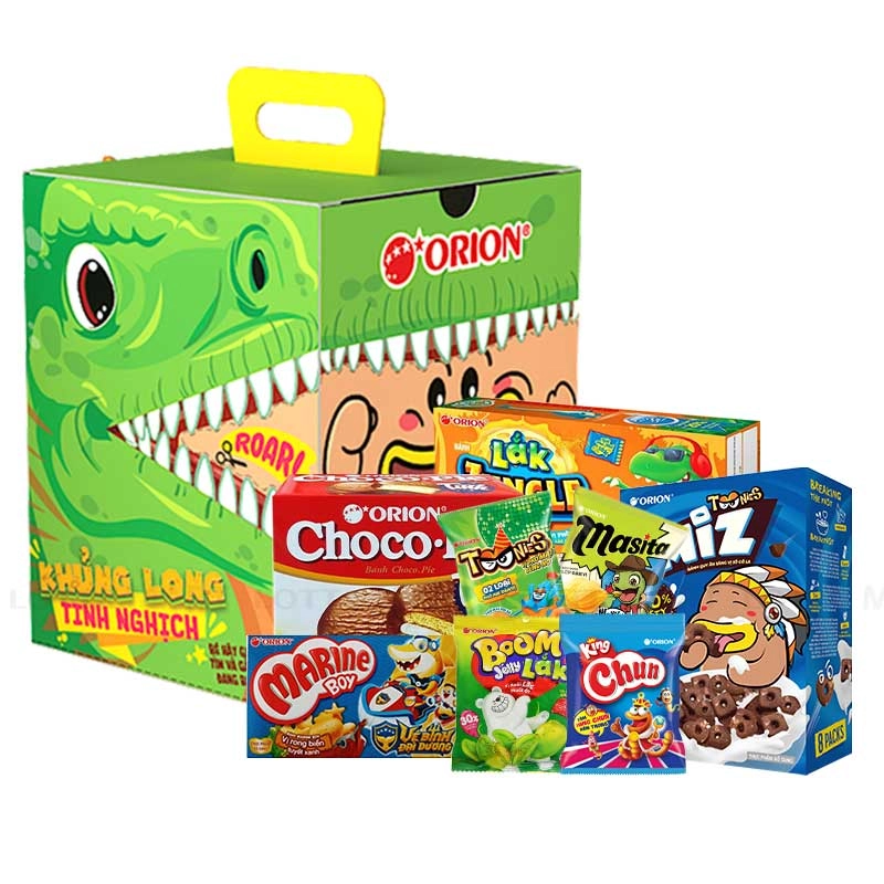 - Hộp Quà Khủng Long Tinh Nghịch Orion là món quà lý tưởng cho các bé vào dịp lễ sắp tới mà ba mẹ không nên bỏ qua. Hộp quà không chỉ chứa đựng những loại bánh kẹo thơm ngon mà còn có thể được cắt ra để chơi trò chơi lắp ghép.