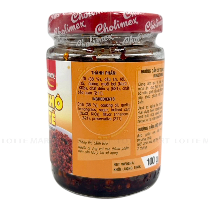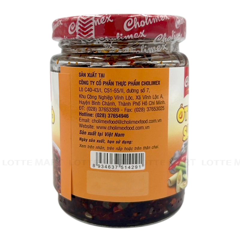 Thành phần: Ớt (38%), dầu ăn, sả, tỏi, muối ăn, đường, chất điều vị, bột ngọt, chất bảo quản
