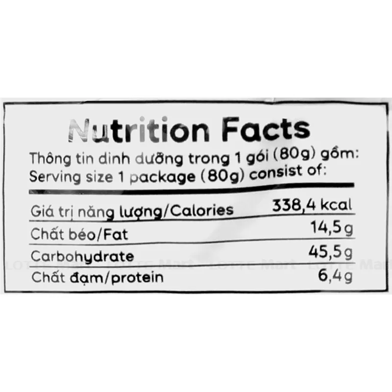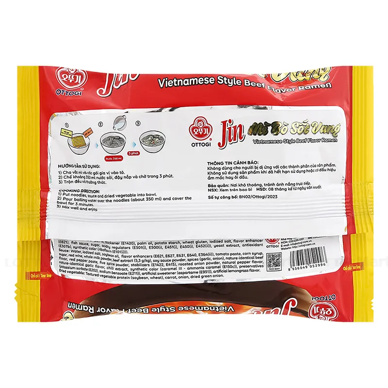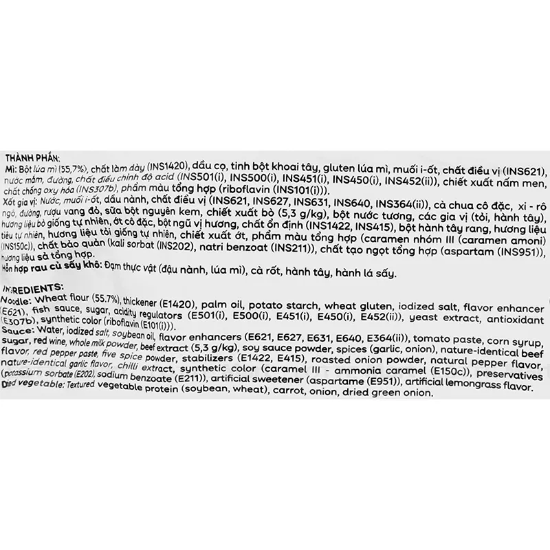 - Mì: Bột lúa mì (55.7%), chất làm dày (INS1420), dầu cọ, tinh bột khoai tây, gluten lúa mì, muối i-ốt, chất điều vị (INS621), nước mắm, đường, chất điều chỉnh độ acid, chiết xuất nấm men, chất chống oxy hóa (INS307b), phẩm màu tổng hợp,...