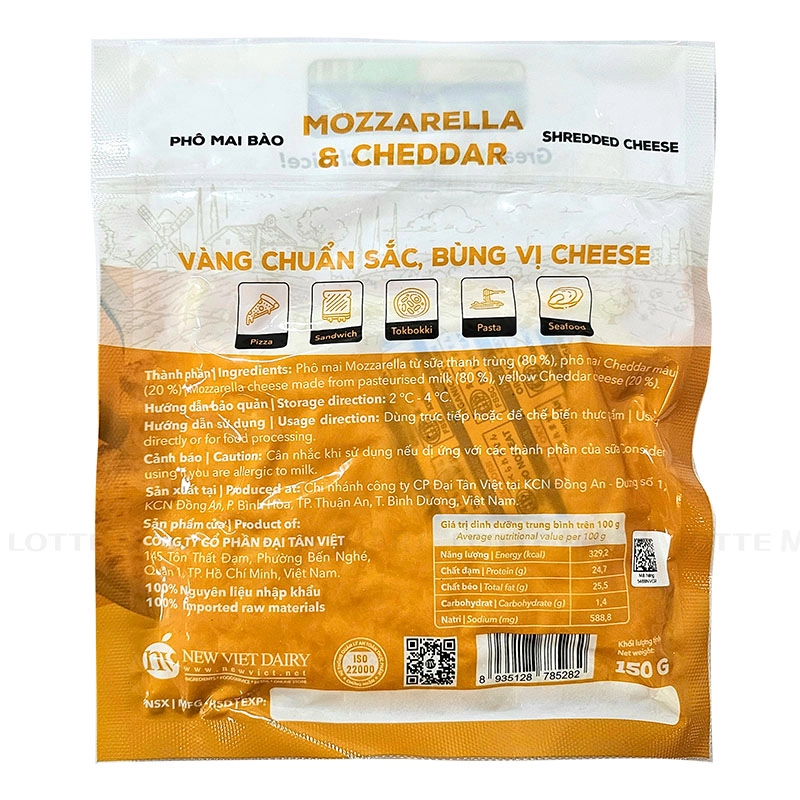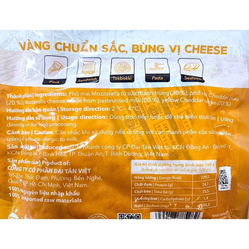 - Phô mai Mozarrella từ sữa thanh trùng (80%), phô mai Cheddar màu (20%).