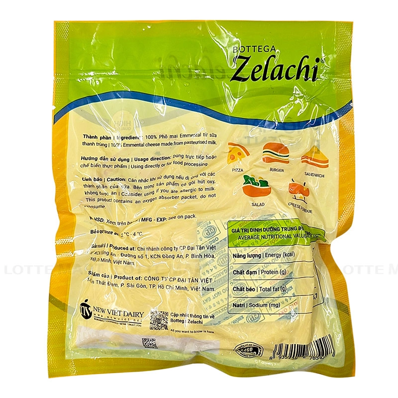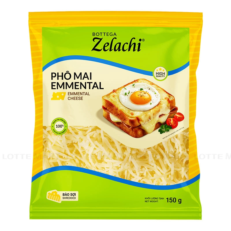 - Phô mai Emmental bào sợi Bottega Zelachi được đóng gói kín, bên trong có gói hút oxy nhằm hỗ trợ duy trì chất lượng trong thời gian bảo quản.