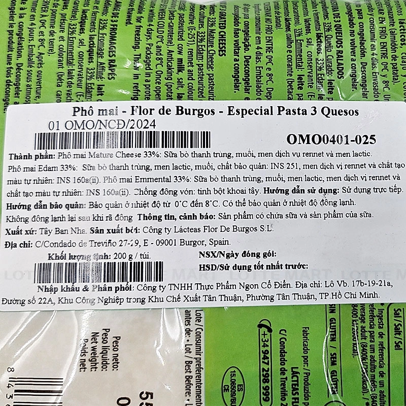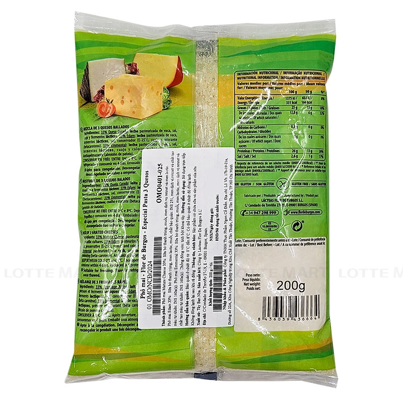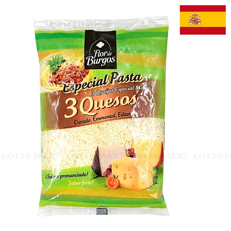 - Phô Mai Flor de Burgos Especial Pasta 3 Quesos là hỗn hợp phô mai bào sợi nhập khẩu từ Tây Ban Nha, được phối trộn đặc biệt để sử dụng trong các món pasta, pizza hoặc các món nướng cần lớp phô mai tan chảy thơm ngon.