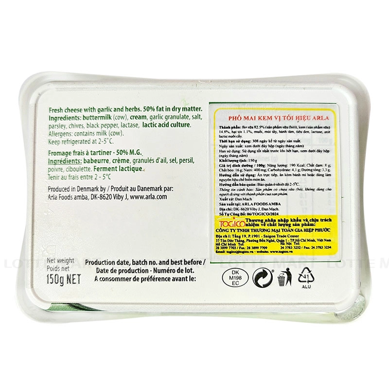 - Phô Mai Kem Vị Tỏi Arla mang đến trải nghiệm ẩm thực tinh tế với sự kết hợp hài hòa giữa vị béo mịn của phô mai và hương tỏi nhẹ nhàng, thơm dịu.