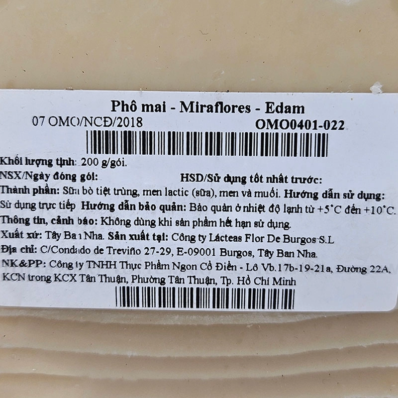 - Phô Mai Edam Cắt Lát Miraflores là sản phẩm phô mai dạng lát tiện dụng, được sản xuất theo phong cách Edam truyền thống. Phô mai có màu vàng nhạt đặc trưng, kết cấu chắc vừa, bề mặt mịn và hương vị nhẹ, dễ dùng trong nhiều món ăn hằng ngày.