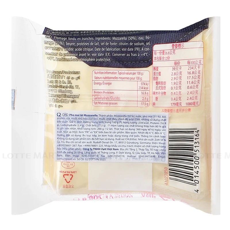 - Phô Mai Lát Mozzarella Gói 200G là sản phẩm nổi tiếng đến từ Đức với chiết xuất từ 100% sữa tươi chất lượng cao. Phô mai lát Zott Mozzarella mang đến hương vị béo mặn hài hoà, thích hợp cho việc ăn kèm với các loại sandwich, hoặc dùng chế biến các loại thịt nướng.