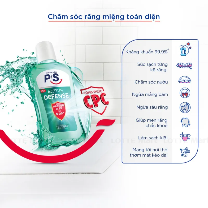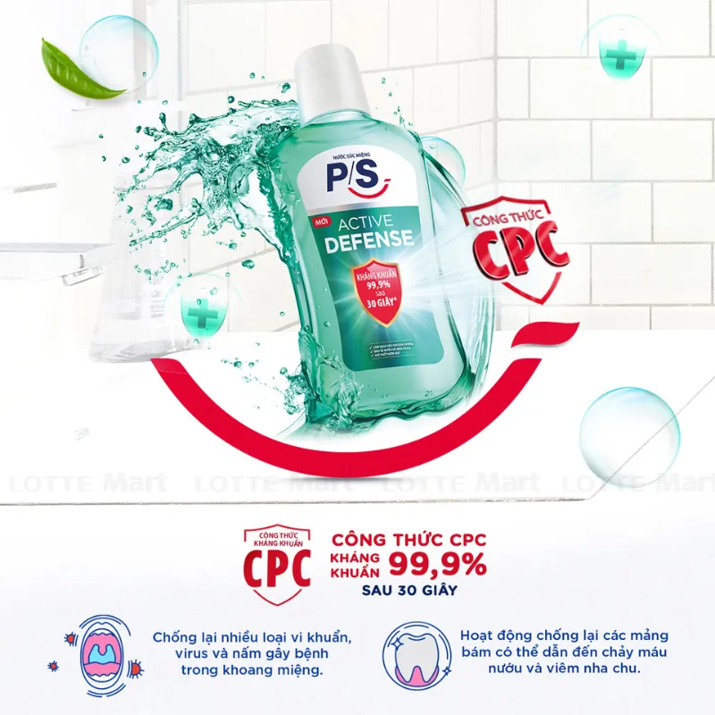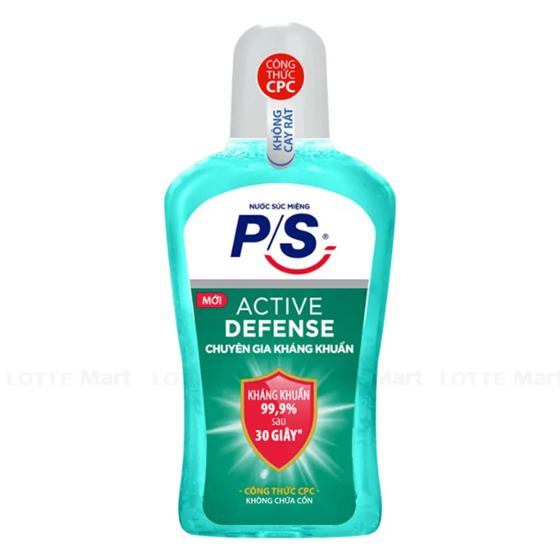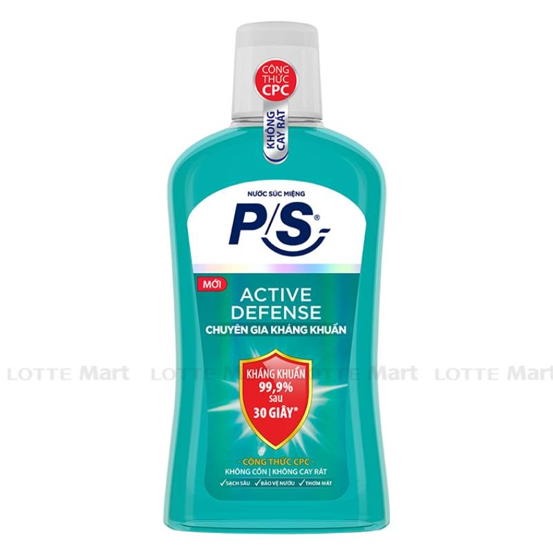 Công thức CPC (cetylpyridinium chloride) giúp chống lại các vi khuẩn thường gặp trong khoang miệng gây mảng bám, sâu răng và hơi thở có mùi. Nước súc miệng P/S Active Defense dịu nhẹ, không cay rát và chứa flouride giúp cả gia đình bạn (bao gồm các bé từ 12 tuổi trở lên) có răng và nướu chắc khỏe lâu dài và hơi thở thơm tho sảng khoái.