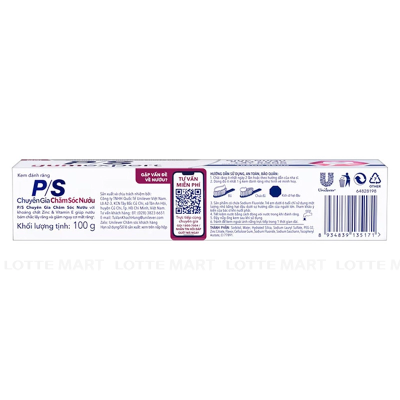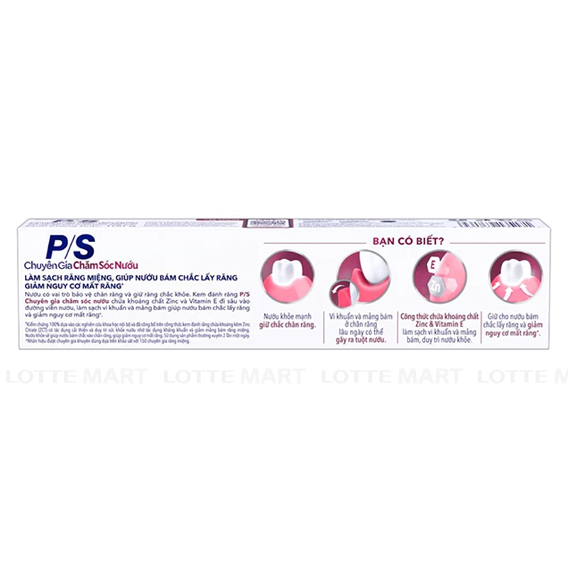 - Kem Đánh Răng P/S Chuyên Gia Chăm Sóc Nướu Trắng Răng với công nghệ từ Pháp chứa thành phần Kẽm Zinc và Vitamin E, giúp làm sạch, ngăn ngừa mảng bám và vi khuẩn tại đường viền nướu hiệu quả và an toàn; cải thiện và nuôi dưỡng sức khỏe nướu.