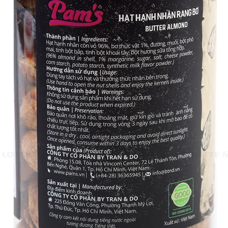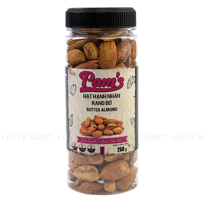 Hạt Hạnh Nhân Rang Bơ Pam’s sử dụng 100% hạt hạnh nhân tự nhiên, chọn lọc kỹ lưỡng, qua quá trình rang sấy hiện đại, đảm bảo an toàn vệ sinh và dinh dưỡng trong từng hạt nên rất an toàn cho người sử dụng.Sản phẩm không chứa Trans Fat, không Cholesterol, không chất phụ gia, không chất bảo quản.Hướng dẫn sử dụng: Dùng trực tiếp hoặc làm nguyên liệu cho các món ăn. Sử dụng trong vòng 3 ngày sau khi mở bao để có chất lượng nổi bật.