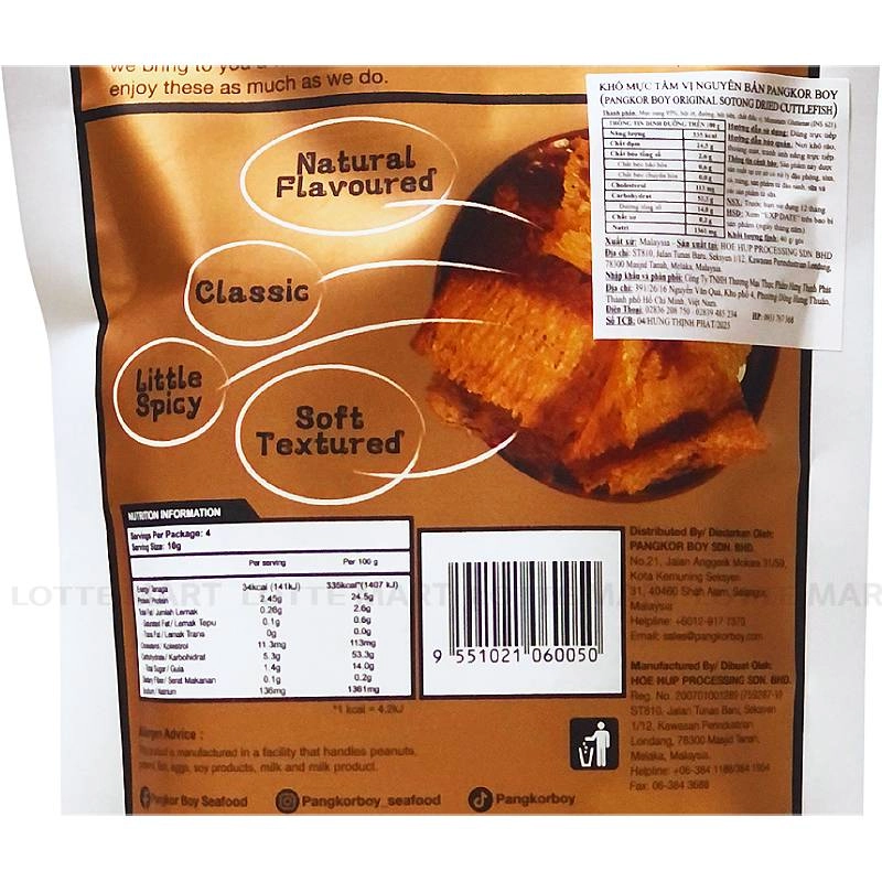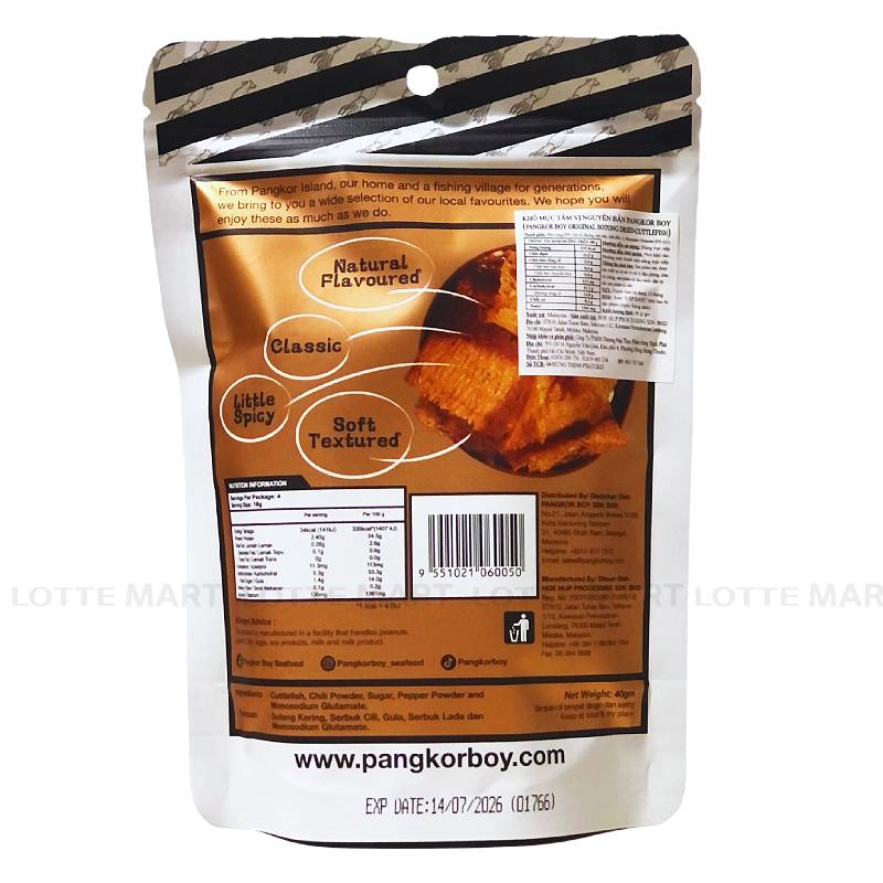 Khô Mực Pangkor Boy Vị Nguyên Bản là sản phẩm đến từ Malaysia, được làm từ mực nang thật (Real Cuttlefish), mang đến sản phẩm chất lượng với hương vị mực thật.