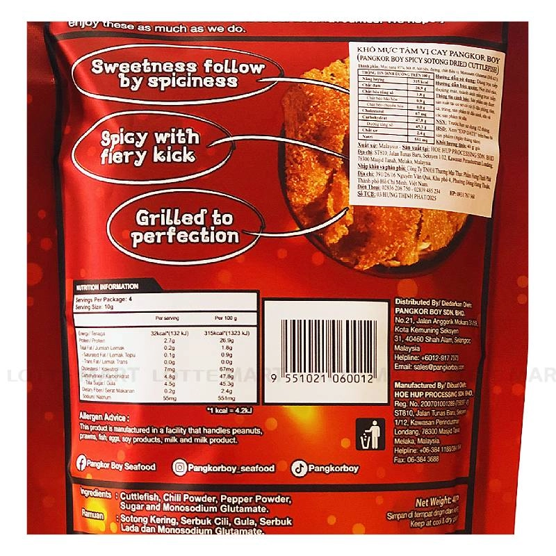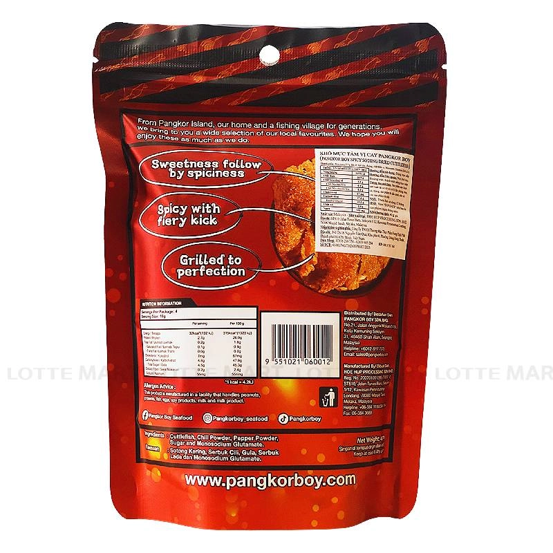 Khô Mực Pangkor Boy Tẩm Cay là sản phẩm đến từ Malaysia, được làm từ mực nang thật (Real Cuttlefish), mang đến sản phẩm chất lượng với hương vị mực thật.