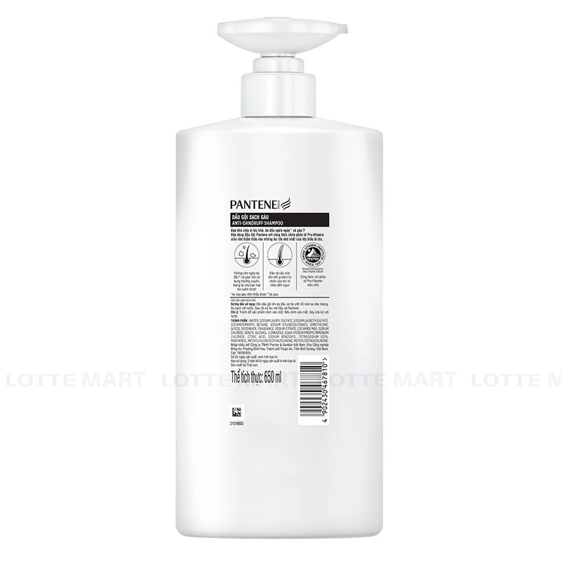 Dầu gội Pantene chứa hai thành phần quan trọng là Panthenol và Panthenyl Ethyl Ether thấm sâu vào từng sợi tóc. Công thức đặc chế chuyên biệt được tăng cường zinc pyrithione sẽ giúp nhẹ nhàng lấy sạch bụi bẩn cũng như chất nhờn trên tóc và da đầu mà không làm khô da, làm sạch và ngăn ngừa gàu quay trở lại.