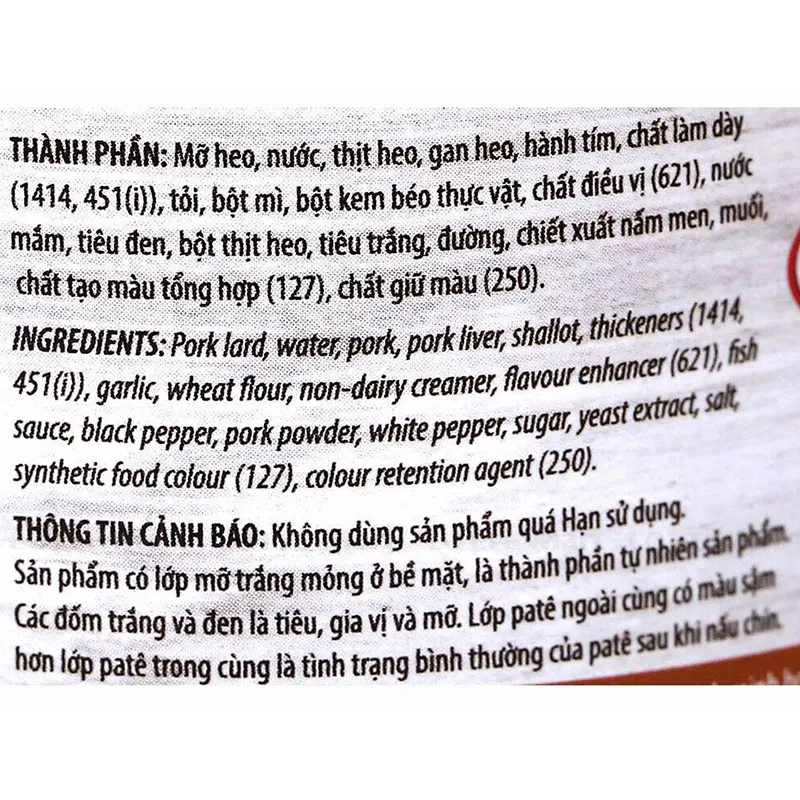 • Mỡ heo, nước, thịt heo, gan heo, hành tím, chất điều vị (451i), tỏi, bột mì, bột kem béo thực vật, bột thịt heo, tiêu trắng, đường, chiết xuất nấm men, muối, chất tạo màu tổng hợp (127), chất giữ màu (250).