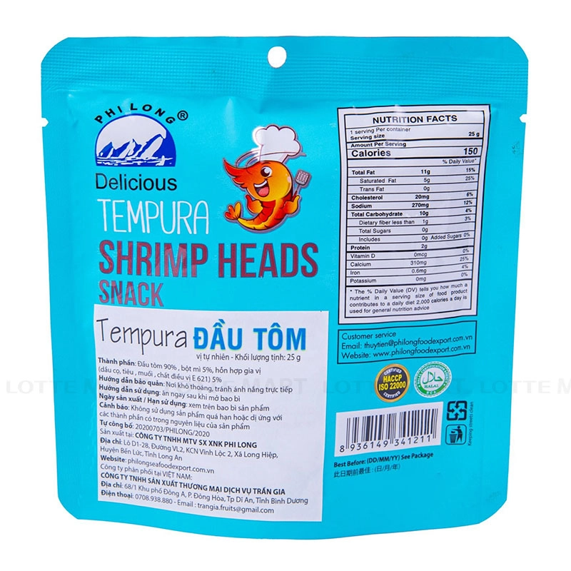 Snack Tempura Đầu Tôm Phi Long là món ăn vặt độc đáo, mang đến trải nghiệm hương vị mới lạ với đầu tôm tươi giòn rụm được chế biến theo phong cách Tempura đặc trưng.