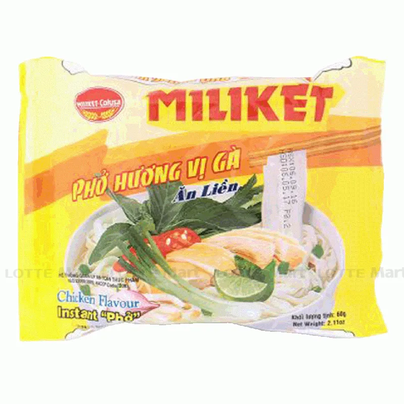 Phở Gà MILIKET 60G là sản phẩm ăn liền chất lượng cao được làm từ gạo, muối, đường, dầu cọ tinh luyện và gia vị được chọn lọc cẩn thận và sản xuất trên dây chuyền hiện đại khép kín, không sử dụng phụ gia độc hại nên tuyệt đối an toàn với sức khỏe người tiêu dùng.