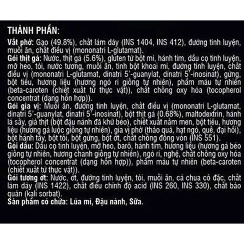 Gói gia vị: Muối ăn, đường tinh luyện, chất điều vị (mononatri L-glutamat, dinatri 5'-guanylat, dinatri 5'-inosinat), bột thịt gà (0.68%), maltodextrin, hành lá sấy, giả thịt (bột đậu nành đã khử béo), chiết xuất nấm men, bột tiêu, hương liệu (hương gà luộc giống tự nhiên), gia vị phở (thảo quả, hạt ngò, quế, đại hồi), bột hành tây, bột tỏi, bột gừng, bột ớt, chất chống đông vón (INS 551),