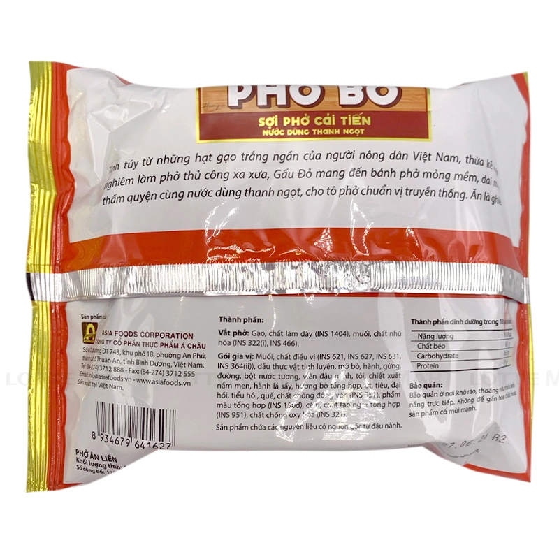 Thành phần: Gạo, tinh bột khoai mì biến tính (1404, 1412), muối I-ốt, chất điều vị (621, 627, 631, 364 (ii)), mỡ bò, dầu thực vật tinh luyện, đường, viên đậu nành, hành, tiêu, tỏi, ớt, nước tương, các gia vị, rau sấy, chiết xuất bò (2 g/kg), chất nhũ hoá (466, 322(i)), hương tổng hợp dùng trong thực phẩm, màu caramel (150d), chất ngọt tổng hợp, chất bảo quản (202, 212), chất chống oxy hoá. Sản phẩm có chứa các nguyên liệu có nguồn gốc từ đậu nành.