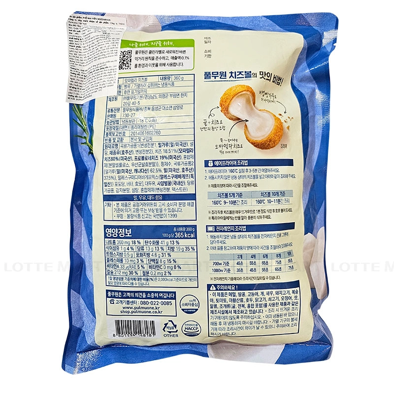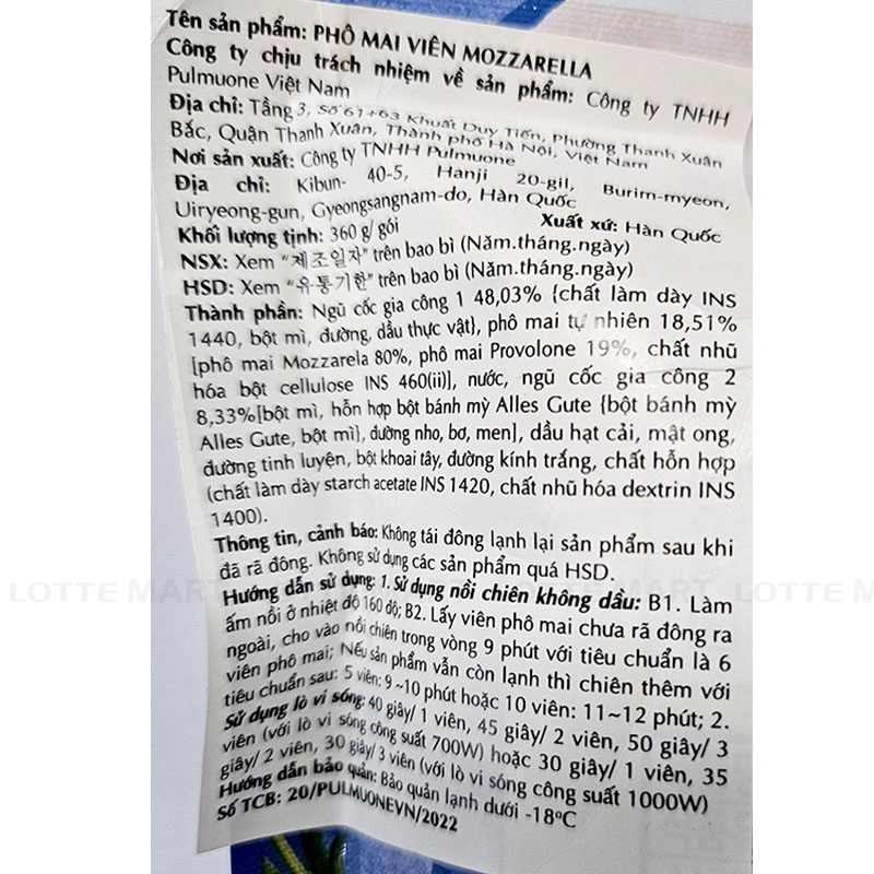 Phô mai viên được làm với nhiều phô mai Mozzarella tự nhiên 100- thơm và dẻo. Bột bánh được lên men đến lúc chín và giòn ở bên ngoài bánh mì mềm có thể quay được trong lò vi sóng để có thể thưởng thức bánh ngon hơn. Bánh sẽ rất ngon ngay cả khi bạn chỉ ăn không nhưng sẽ tuyệt hơn khi bạn kết hợp với nhiều loại nước sốt salad hoặc thậm chí cả bánh gạo cay nữa.