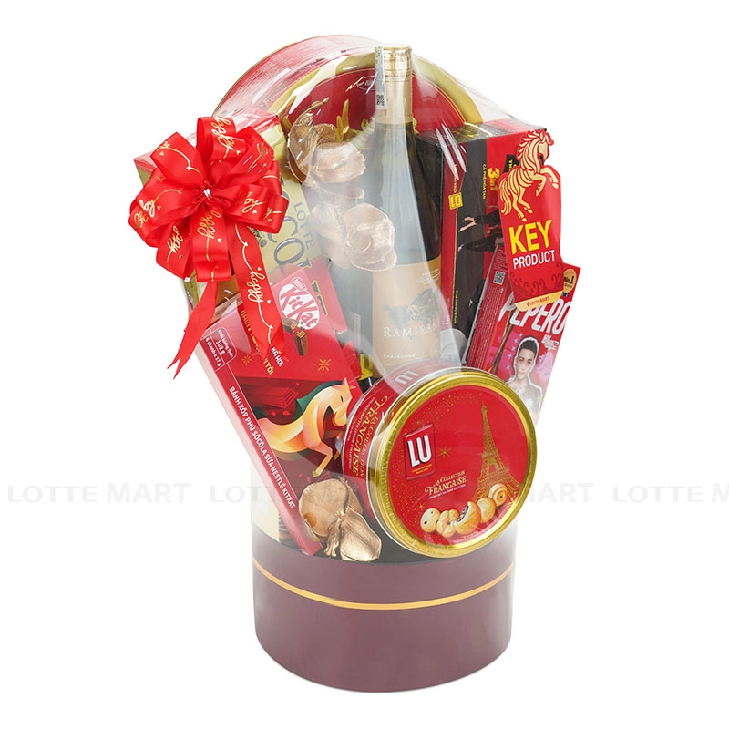Với sự kết hợp của rượu vang trắng thanh lịch, các loại bánh kẹo hộp thiếc và trà truyền thống, giỏ quà này không chỉ đa dạng về hương vị mà còn được trang trí với tông đỏ và vàng kim nổi bật, thể hiện sự trân trọng và tấm lòng của người gửi.