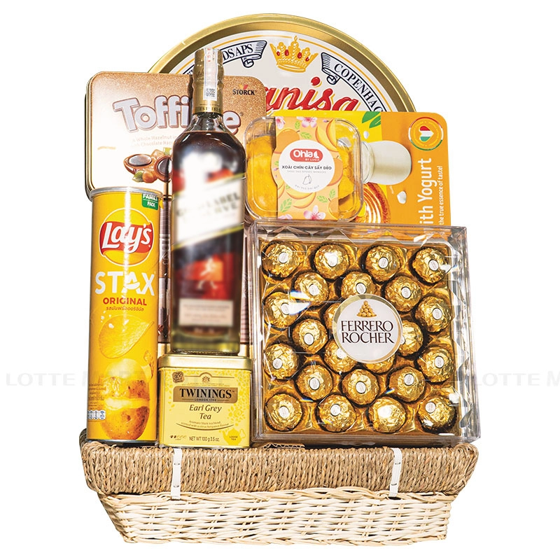 Giỏ quà bao gồm 11 sản phẩm là Rượu Whisky Johnnie Walker Gold Label 40% ABV Chai 750ml, Bánh Danisa Gold Edition Hộp 792G, Trà Lá Lớn Twinings Of London Earl Grey Tea Hộp 100G, Socola Ferrero Rocher 300G, Kẹo Mềm Toffifee Caramel Phủ Sô cô La Nhân Hạt Dẻ Hộp 125G, Bánh Quy Misura Sữa Chua Hộp Thiếc 300G, Cà Phê Sữa Hòa Tan NesCafé Signature Hộp 28G x 10 Gói, Snack Lay's Stax Vị Tự Nhiên Hũ 150G, Bánh Trứng Sữa Chua Hạt Điều Tipo Hộp 126G, Trà Đào Lipton Hòa Tan Tươi Mát Hộp 16 Gói x 12G và Xoài Sấy Dẻo Ohla Hộp 200G.