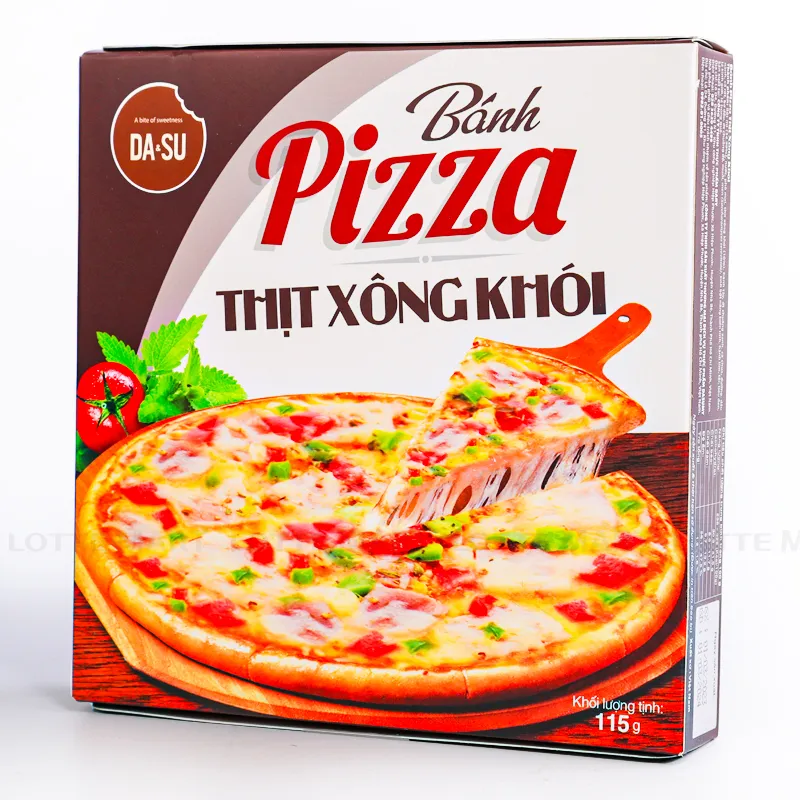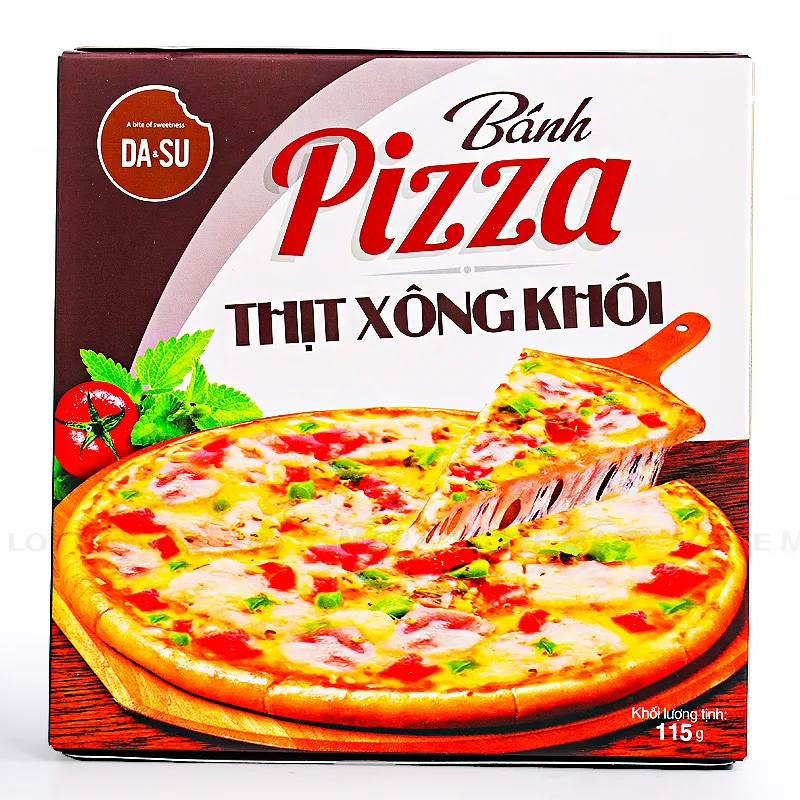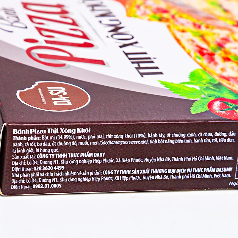 Thành phần: Bột mì, nước, phô mai mozrella, thịt đùi xông khói, cà chua, dầu cọ