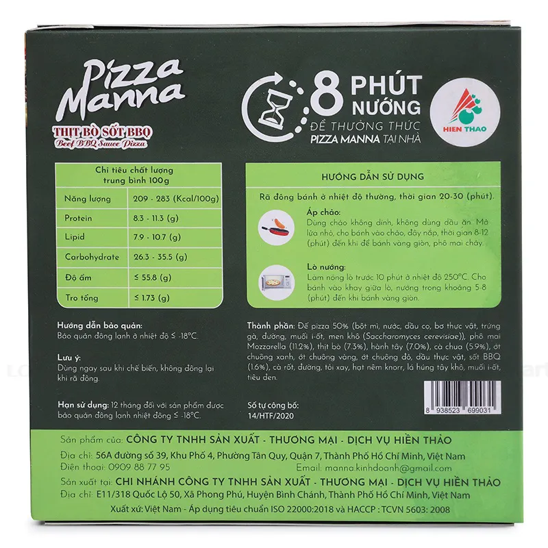 Thành phần: Đế pizza 50%, phô mai, hành tây, cà chua, ớt chuông xanh, ớt chuông vàng, thịt bò, sốt BBQ,...