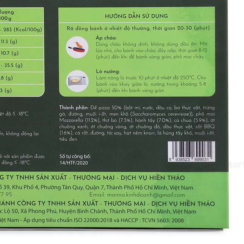 Chế biến: Rã đông bánh ở nhiệt độ thường từ 20-30 phút. Áp chảo - Dùng chảo không dính, không dùng dầu ăn. Mở lửa nhỏ, cho bánh vào chảo, đậy nắp thời gian 8-12 phút đến khi đế bánh vàng giòn, phô mai cháy. Lò nướng - Làm nóng lò trước 10 phút ở nhiệt độ 250 độ C. Cho bánh vào khay giữa lò, nướng trong khoảng 5-8 phút đến khi bánh vàng giòn.