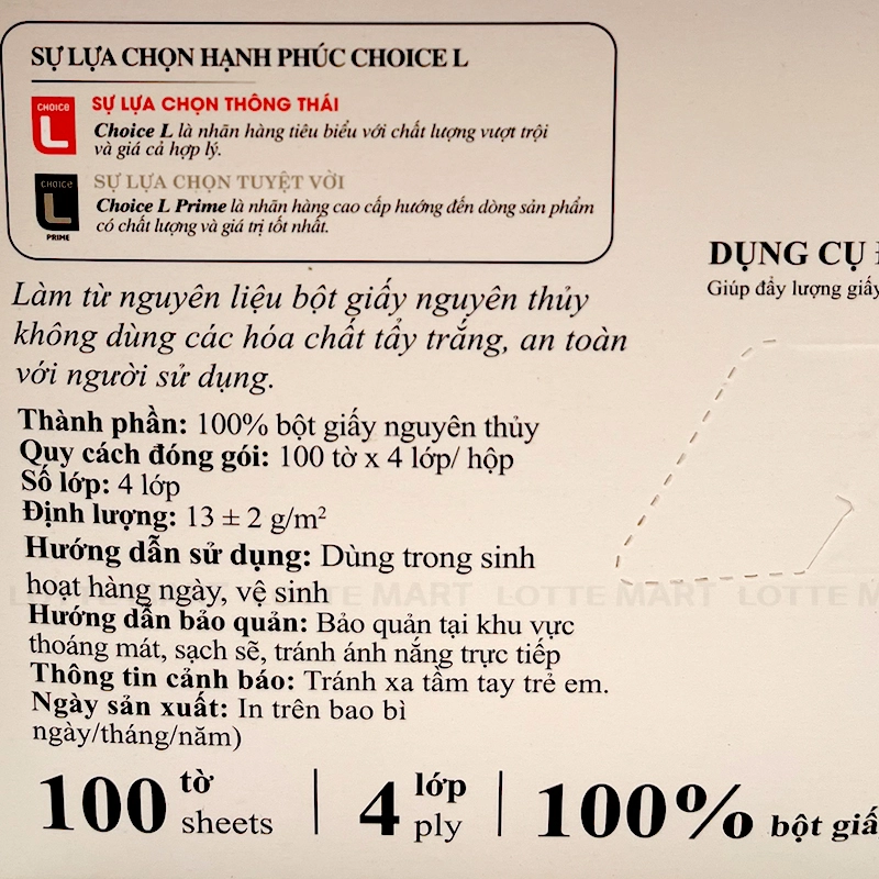 Khăn Giấy Lụa Cao Cấp Choice L 4 Lớp có thành phần làm từ 100% bột giấy nguyên chất, không dùng các hóa chất tẩy trắng, an toàn cho người sử dụng. Đây chính là lựa chọn hoàn hảo cho mọi gia đình, đảm bảo sự hài lòng với chất lượng vượt trội.