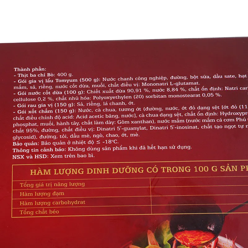 - Rã đông phần thịt, gói gia vị lẩu, gói nước cốt dừa, gói rau gia vị và gói sốt chấm.