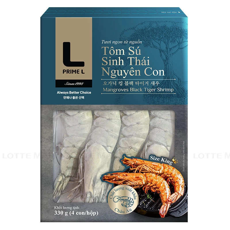 Tôm Sú Sinh Thái Nguyên Con Prime L là sản phẩm tôm được nuôi tự nhiên, không chứa kháng sinh và không hóa chất trong cánh rừng ngập mặn nguyên sinh tại Cà Mau.