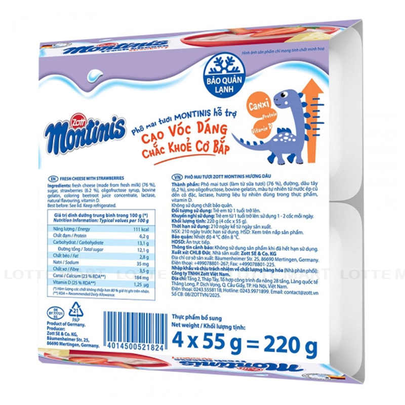 - Phô Mai Tươi Zott Montinis Vị Dâu mang đến vị chua nhẹ, béo dịu của phô mai tươi kết hợp cùng dâu tây tự nhiên thơm ngọt, giúp bé dễ ăn và thêm hứng thú trong mỗi bữa nhẹ hằng ngày.