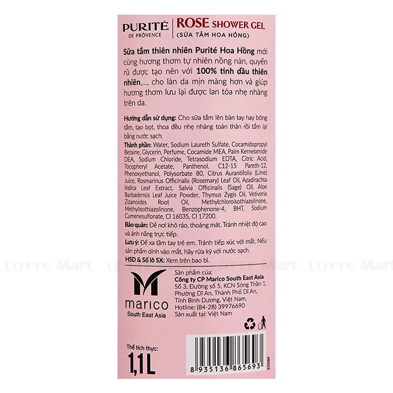 - Sữa Tắm Purité Dưỡng Da Mềm Mịn Hương Hoa Hồng chứa tinh dầu hoa hồng tự nhiên cùng chiết xuất ôliu, nhẹ nhàng làm sạch, mềm mịn da và lưu lại hương hoa hồng nồng nàn quyến rũ trên làn da tự nhiên của bạn.