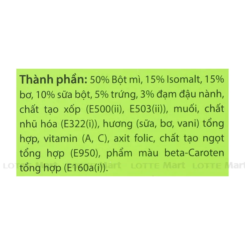 - Thành phần: Bột mì, isomalt, chất béo thực vật, 12.6% sữa bột, trứng, chất tạo xốp (E500ii, E503ii), muối, chất nhũ hóa (E322), ...