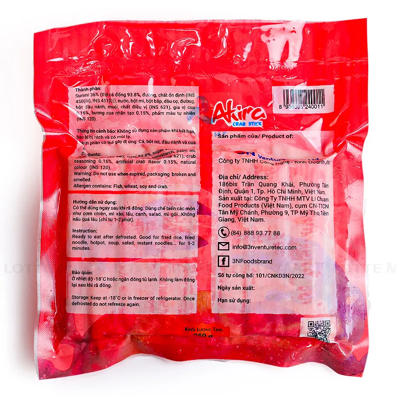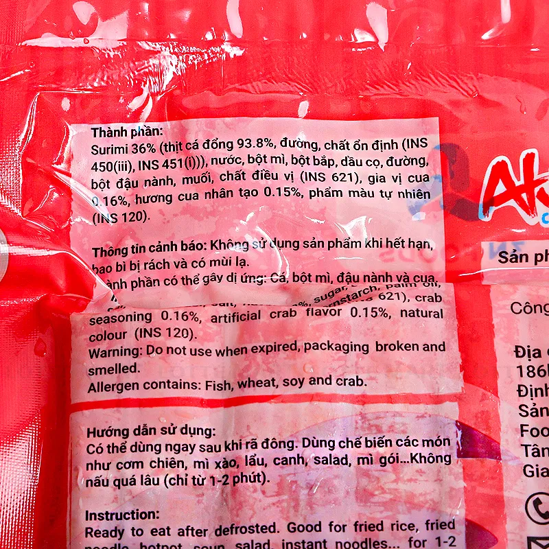 Que Surimi hương cua Akira với thành phần chính gồm surimi, tinh bột, muối, đường, chiết xuất cua, hương cua… mang lại hương vị thơm ngon, đậm đà khi thưởng thức.
