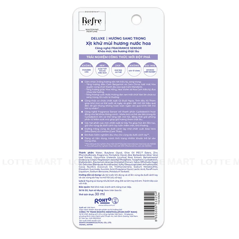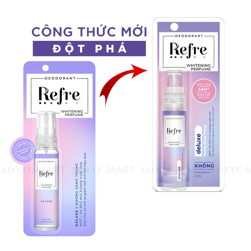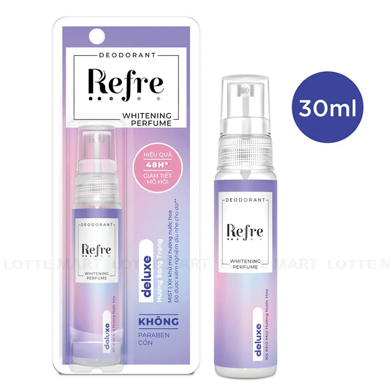 - Xịt Ngăn Mùi Dưỡng Trắng Refre Hương Sang Trọng Chai 30ml là dòng sản phẩm xịt khử mùi dành cho nữ đến từ thương hiệu Refre, giúp khử mùi cơ thể và giảm tiết mồ hôi hiệu quả, đồng thời lưu lại mùi hương nước hoa thật lâu với công nghệ khoá mùi Fragrance Sensor và ba tầng hương đặc trưng.