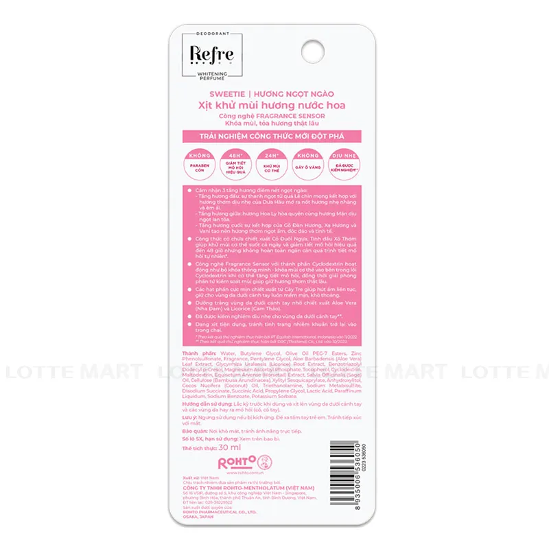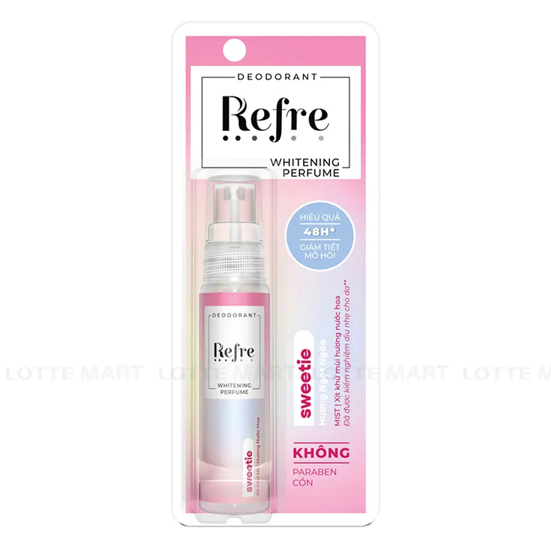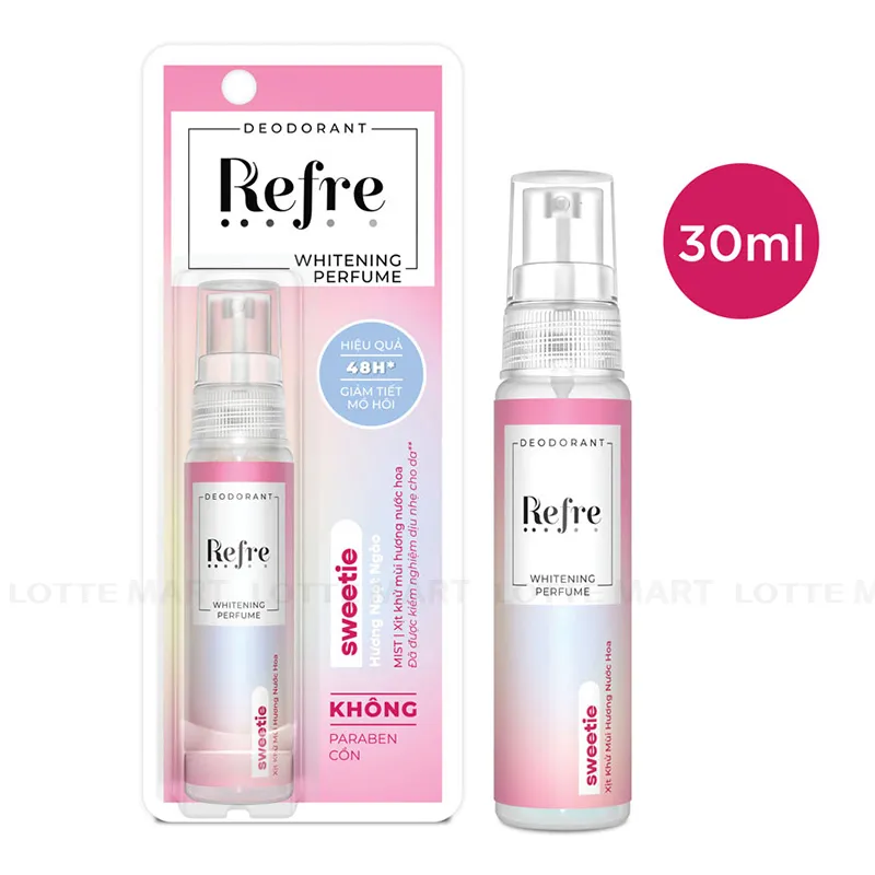 - Xịt Ngăn Mùi Dưỡng Trắng Refre Hương Ngọt Ngào 30ml là dòng sản phẩm xịt khử mùi dành cho nữ đến từ thương hiệu Refre, giúp khử mùi cơ thể và giảm tiết mồ hôi hiệu quả, đồng thời lưu lại mùi hương nước hoa thật lâu với công nghệ khoá mùi Fragrance Sensor và ba tầng hương đặc trưng ở nước hoa.
